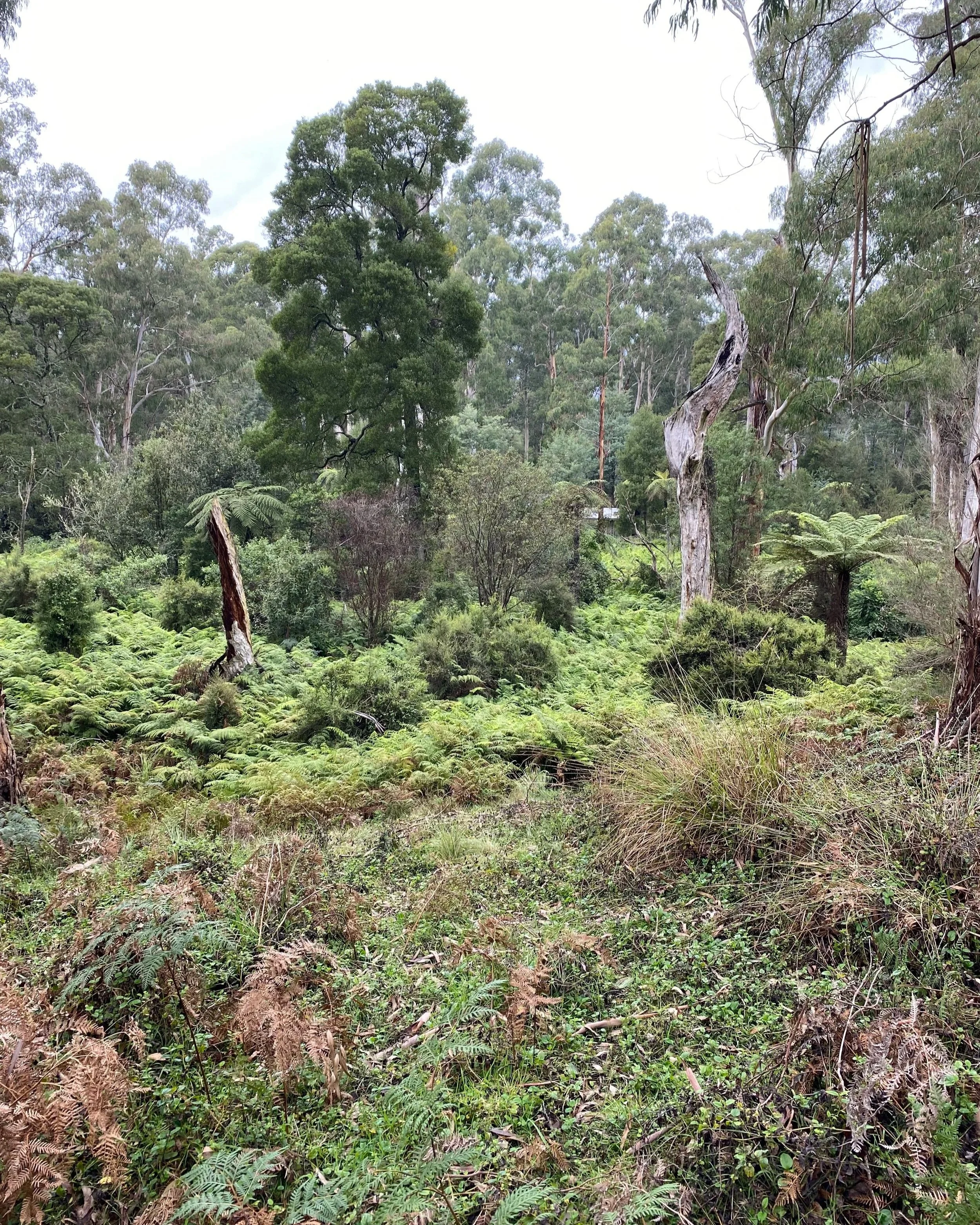 Aunty Sheree, quite amazingly, winds her way through the bush with her walking frame. She wanders along the muddy path with tree roots bursting from the dark moist soil and steps her way over slippery leaves that have fluttered to the ground. Up and up we go to the crest of a hill. If anything, she looks invigorated. This is her land. She breathes deeply and smiles.